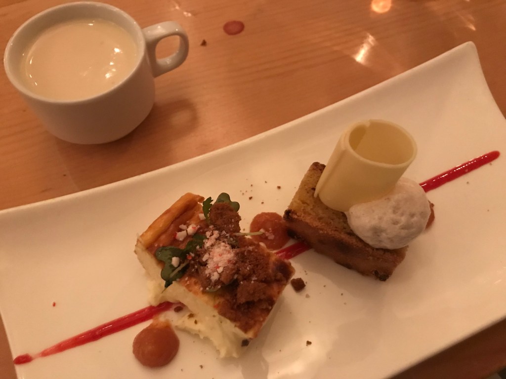 The butternut squash itself was a bit bland, but when I got a bite of pork tenderloin, butternut squash puree, and cranberry preserves, the flavors sang. That, and the quail + brown butter stuffing + pomegranate, were the two most quintessentially Christmas bites of this meal.