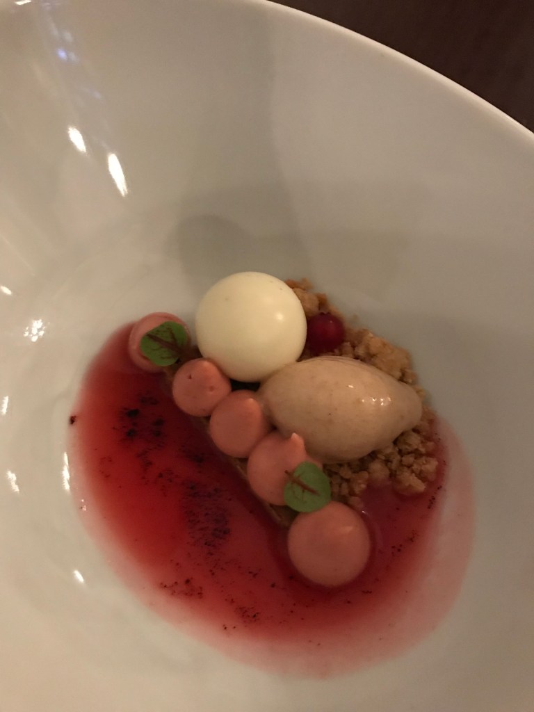 Dessert was a series of little globules lined up in a bowl—almond and thyme panna cotta, almond sorbet, and redcurrant with some kind of crumble. Somehow, this dish lacked the richness and sense of indulgence I expect from a dessert. The heavy almond flavor and thyme made it so light and non-sweet that it was almost savory, and I could feel a little graininess from the almond in the panna cotta. It was good, but didn’t quite feel like the close of a meal to me. I did love the redcurrant, though.
