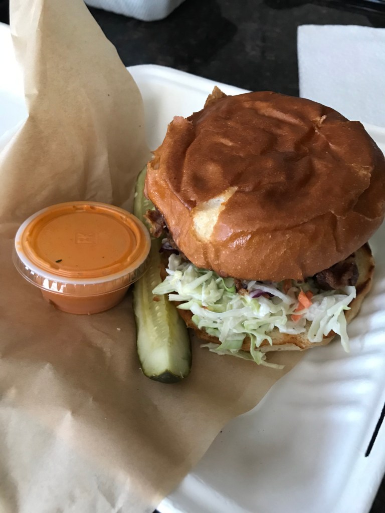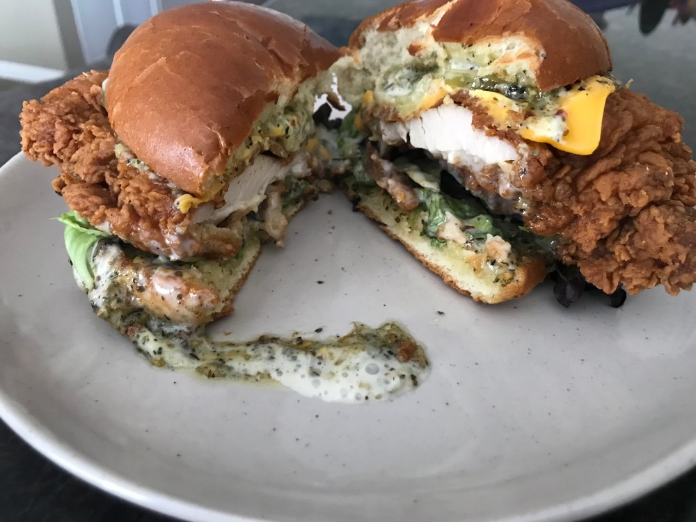It has this great remoulade-type sauce that gives the sandwich a nice, tangy, briny bite. They’re generous with pickles. The chicken stretches out farther than the bun, jutting out from both sides and covering twice the distance as the sandwich itself.